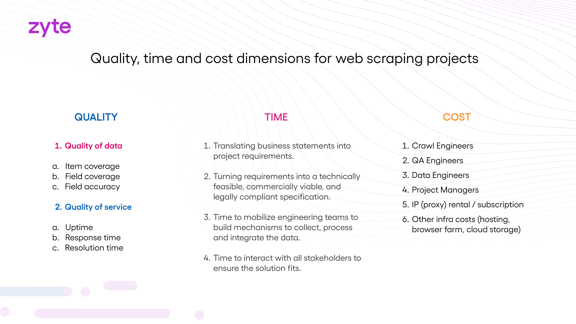 Quality: Quality reflects the accuracy and completeness of data. Scraping tools, developer skills, and data processing levels all affect it.