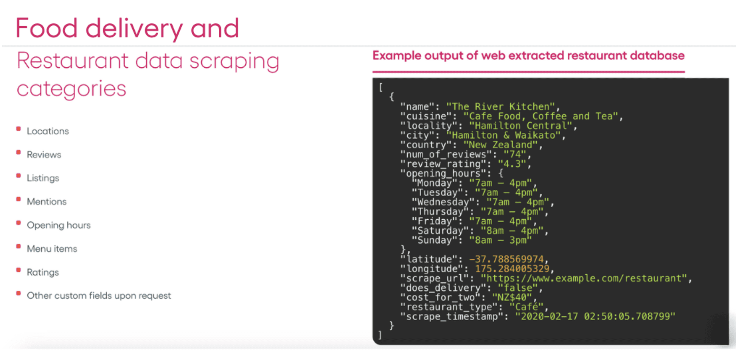 If your food delivery service is preparing to enter a new market, having access to insights unseen by your competition or building a sales and marketing database is an indisputable advantage. Or get web data to understand lead generation, competitive pricing, product placement, distribution channels, customer sentiment, and influencers. The opportunities are unlimited.