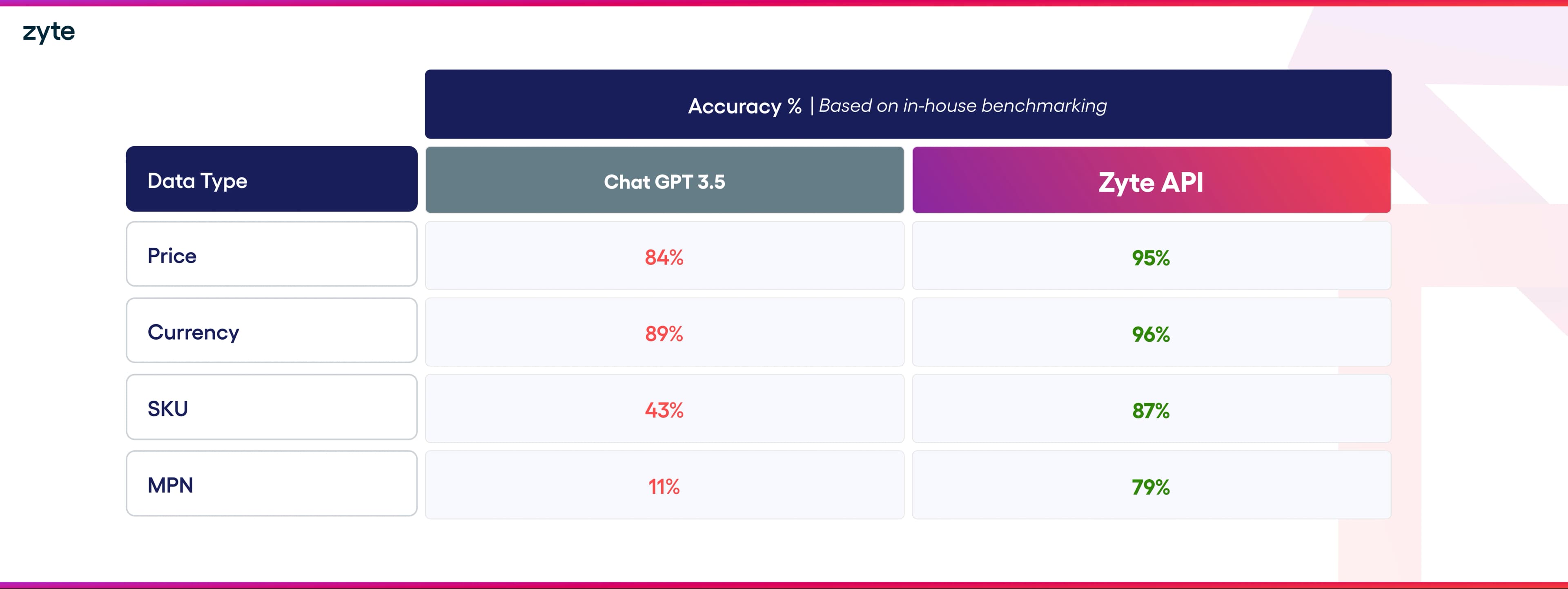 From our internal benchmarking, Zyte API can extract data faster and more accurately than ChatGPT.
