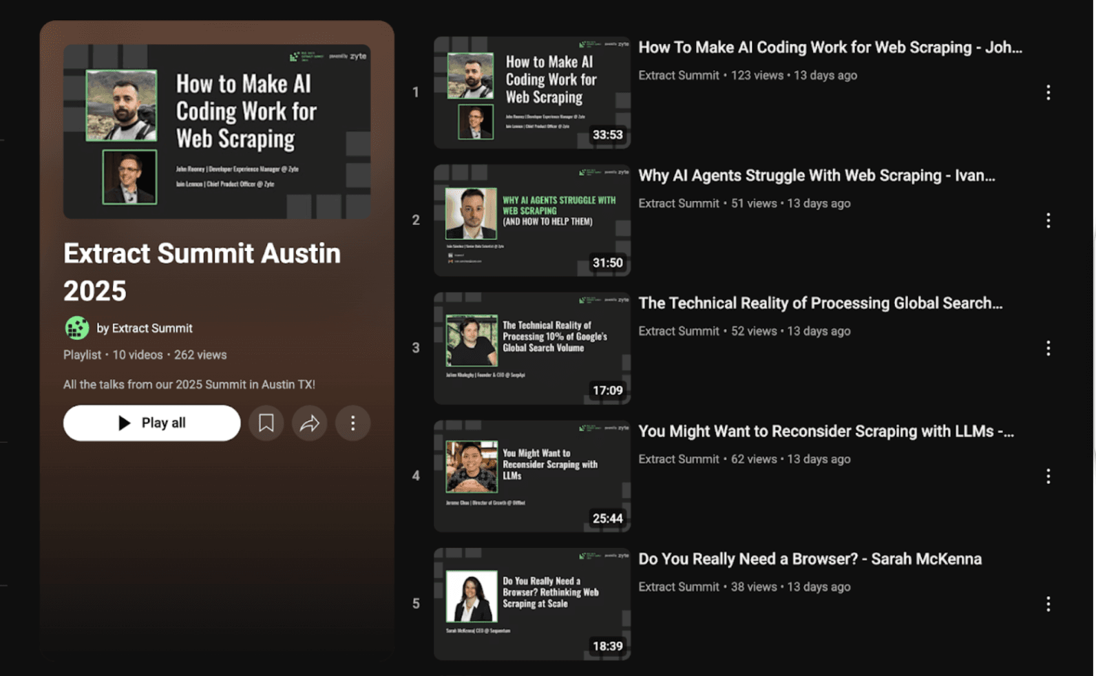 Extract Summit Austin in September was a blast. Watch deep-dives from the summit into Zyte’s latest features, practical demos, and industry insights from data leaders shaping the future of web data. Catch up anytime and see what’s next for the ecosystem.