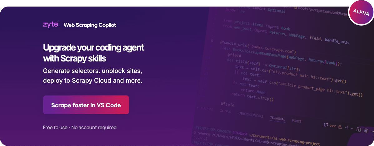 The Web Scraping Co-pilot doesn't replace you. It accelerates you. It automates the 90% of work that is "grunt work" (finding selectors, writing boilerplate, creating tests) so you can focus on the 10% of work that matters: crawling logic, strategy, and handling complex sites.