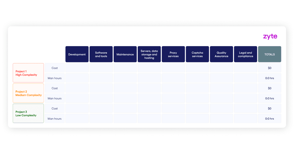 Good cost estimates come from good inputs. For those of you using vendors, your costs are simpler and way more predictable. For those of you managing an in-house team, you need to know how much effort (man hours and operating costs) goes into a web scraping project.