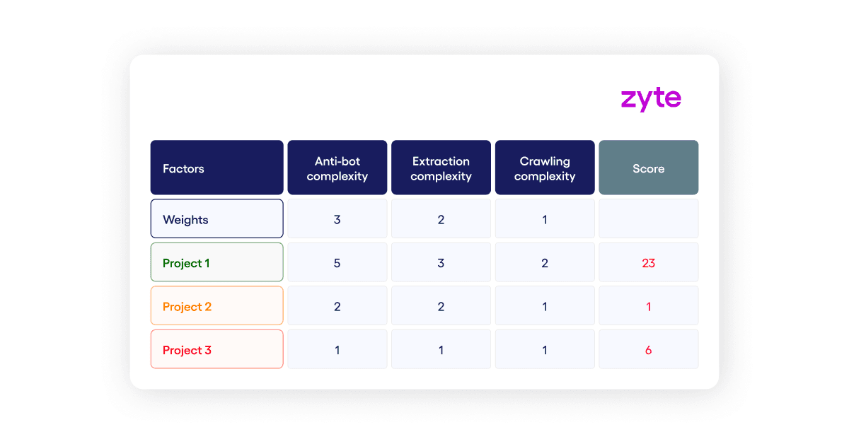 An easy way to deal with the complexity of creating estimates is to use low, medium, and high categories to define a website’s complexity. Here’s a simple matrix you can use (or modify) to define the complexity of your past projects. By defining the complexity of past projects, you can create benchmarks for each category. Those category benchmarks can be used to estimate future projects. The biggest factors impacting complexity in descending order are the anti-bot deployed, extraction logic complexity and crawling logic complexity. The factors are weighted to account for importance. To determine the complexity of a project, take a look at the factors and use 1 to 5 to rank each of them from easy to difficult.