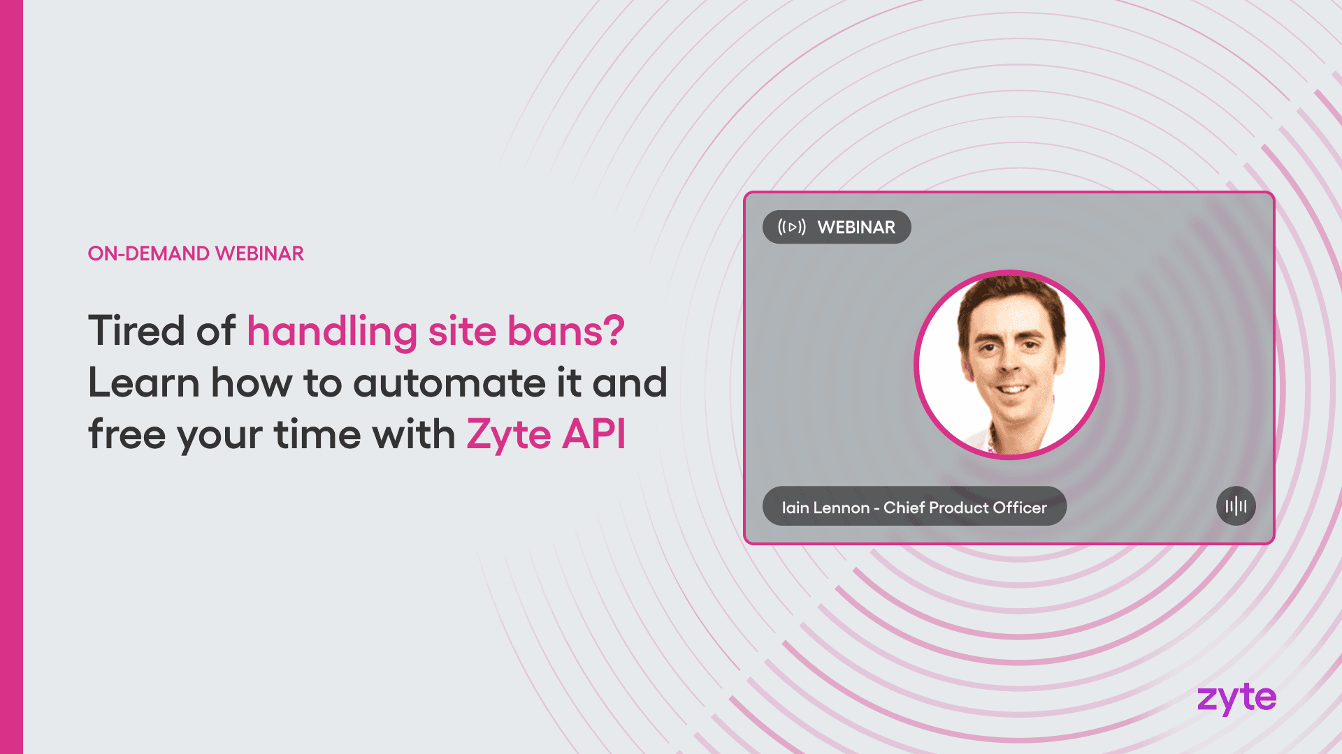 In this webinar, presented by Iain Lennon, our CPO, and Daniel Cave, our Head of Product Marketing, we're diving into Zyte API capabilities for handling bans and how this can be a game-changer for web scrapers trying to run an uninterrupted operation that scales.